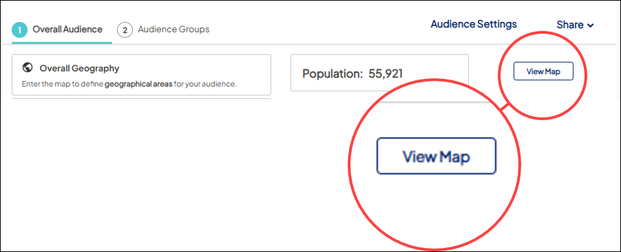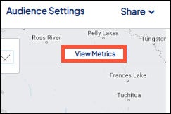 By default, the metrics for the overall audience display when you open a target audience. Choose View Map to open the map in order to use the map view options.
