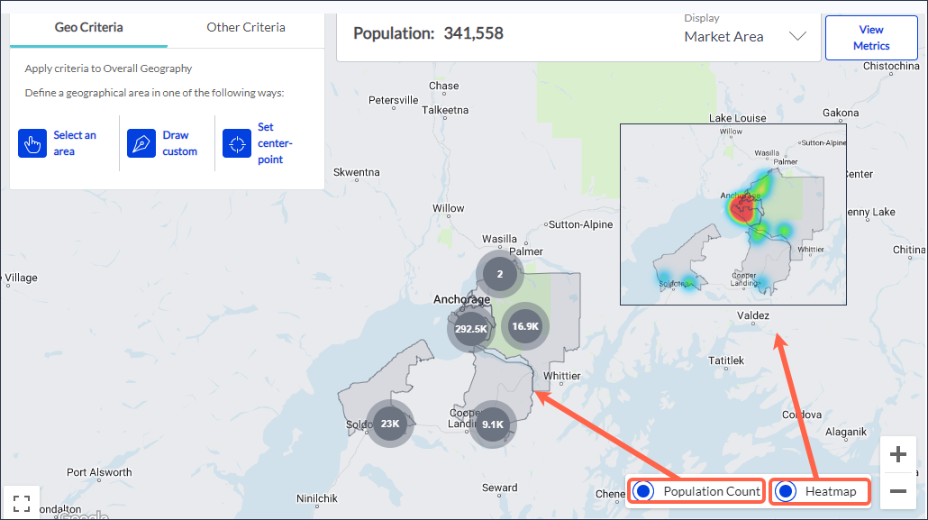 Offers two different methods for visualizing the population density of your current overall audience: Population Count and Heatmap.