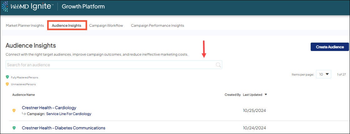 - Use the Search field to find the existing audience - search by audience name or person who created the audience.