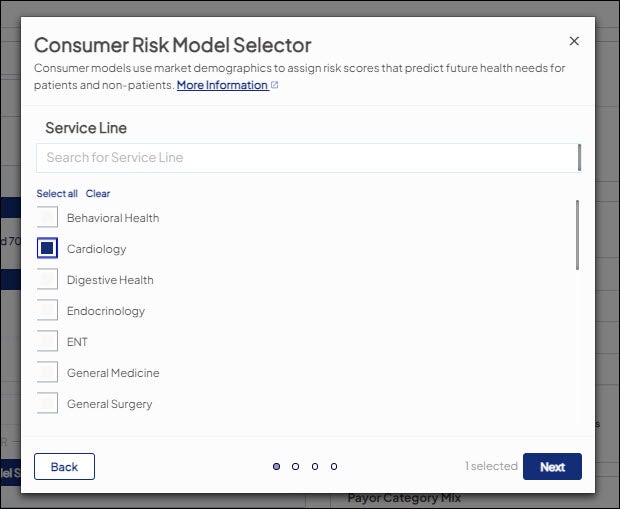 For a service line-based or broadly focused campaign, select specific service lines and/or visit types. Based on those selections, risk models are recommended.
