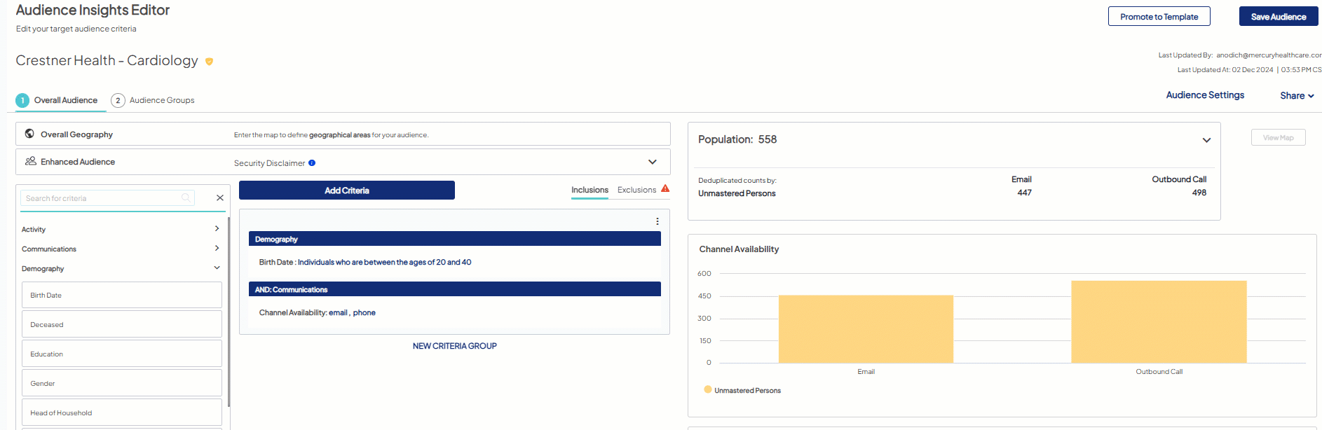 The Overall Audience contains the pool of records (Mastered or Unmastered) that meet the initial set of criteria (depending on the method of creation) and any additional criteria you select. The Overall Audience can be as broad or as specific as you need. Depending on your purpose, you might even consider your Overall Audience complete and ready to send to a marketing channel without subdividing it.