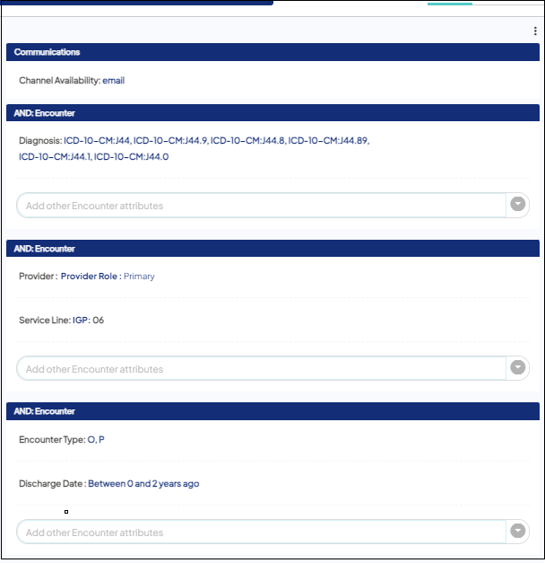 Example: After you drop and drag any criterion from the Encounter category, you have the option of adding another encounter criterion to it. Use the dropdown menu for the Add other encounter attributes... field to apply another Encounter criterion and create a compound criteria.