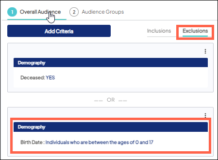 - Birth Date is set to exclude individuals who are between the ages of 0 and 17 since you are not allowed, by law, to market to underage individuals. Learn more about including minors in a target audience.