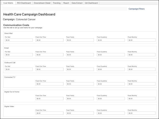 The Cost Matrix tab is the same as Cost Schedule in Ignite Growth Platform is pre-populated with the same values input as part of campaign set up. The value of having it available as part of reporting is that you can make changes to the costs to view different reporting scenarios - and the changes won’t impact what is in Ignite Growth Platform and do not carry forward from one session to the next (it resets to match the Cost Schedule information each time you access reporting).