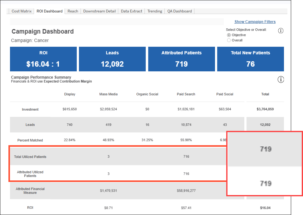 - Total Utilized: Number of patients with downstream visits from the campaign.