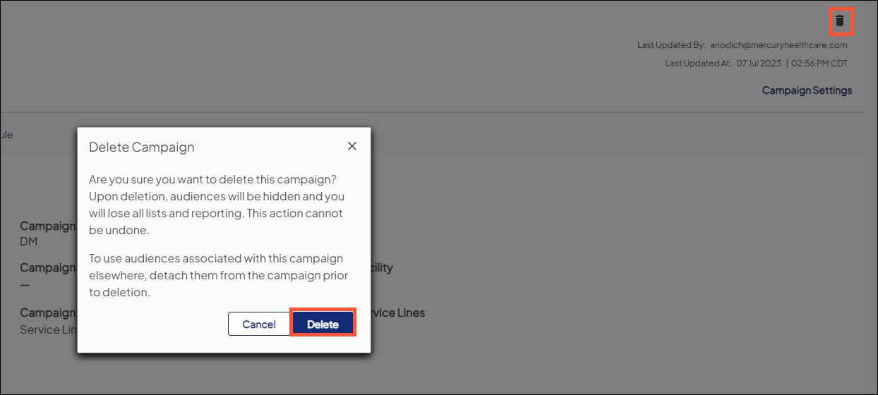 When you delete a campaign, all attached target audiences are also deleted. To save an attached audience from deletion, detach the audience from the campaign.