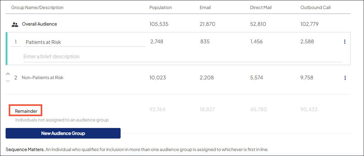 If your target audience has audience groups, then it automatically has a remainder group that contains those individuals who qualify at the Overall Audience level but who do not qualify for any of the audience groups.
