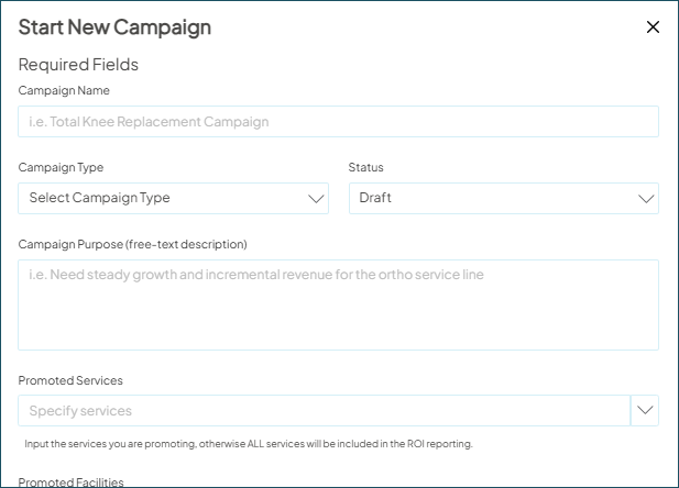 - Go to Campaign Workflow and click New Campaign. The start new campaign window will appear with required and optional fields to complete.