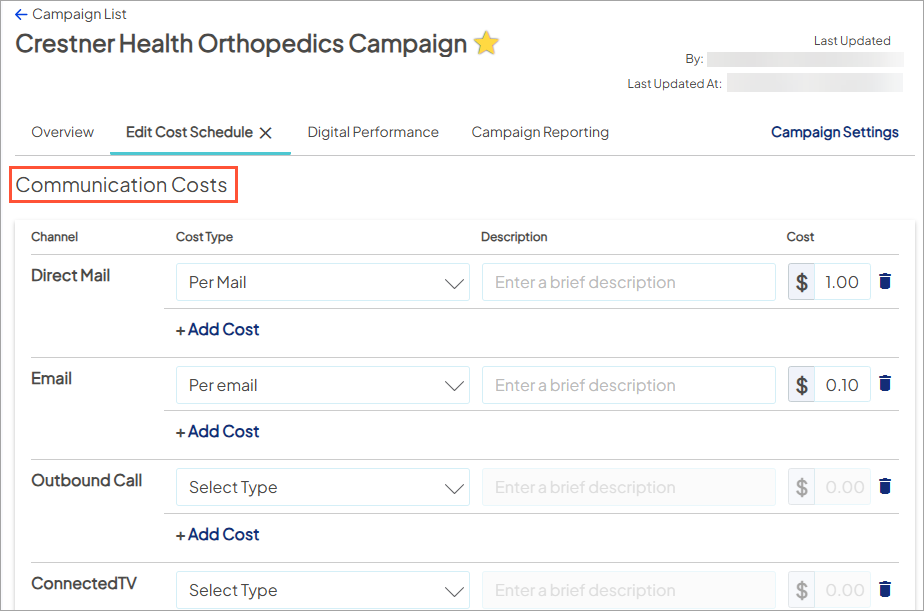 - Inputting costs is a crucial step to ensure that your investment is captured and accounted for in ROI calculations. Make sure accurate costs for all channel types has been added in campaign setup.