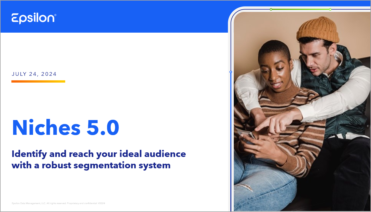 Niches 5.0 is a powerful clustering system that classifies every household in Epsilon's national consumer marketing file TotalSource Plus® into one of 26 meaningful groups. Use Niches 5.0 to gain deeper customer insights, identify your best customer or prospect audiences and develop tailored messaging and offers. Niches 5.0 segments are available for audience selection and activation across all channels.