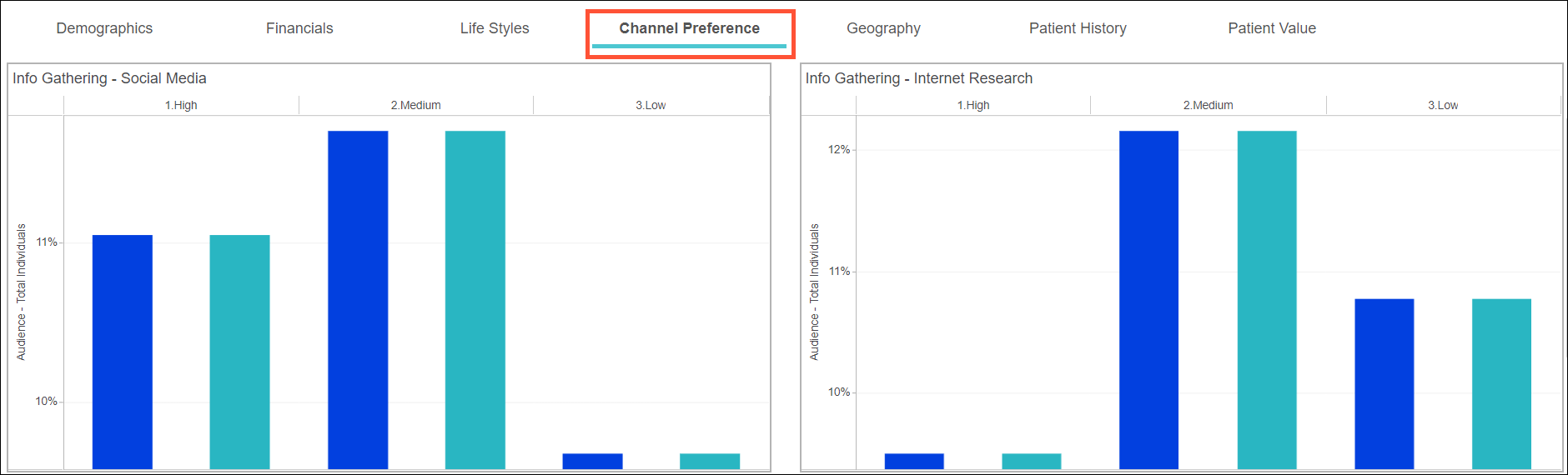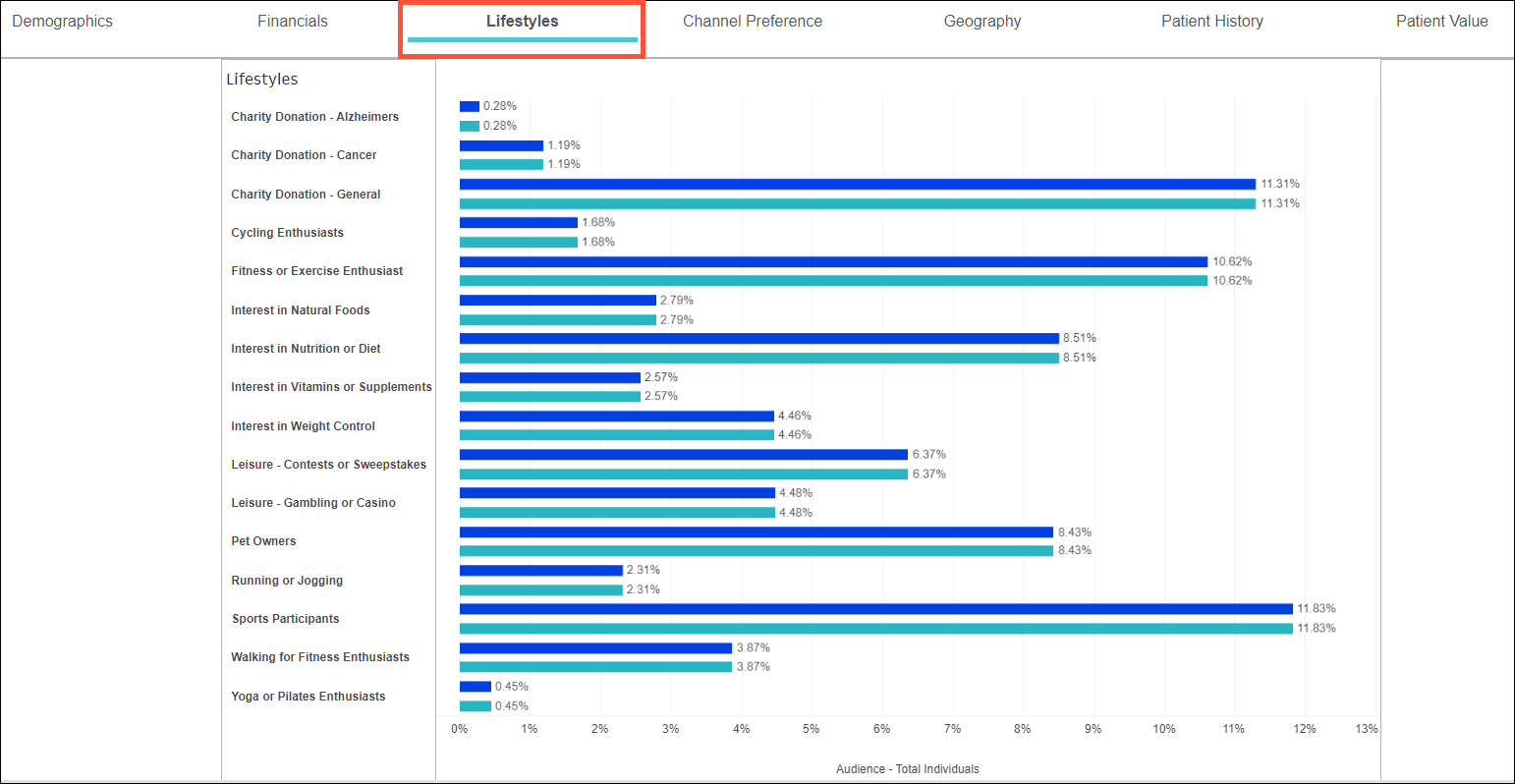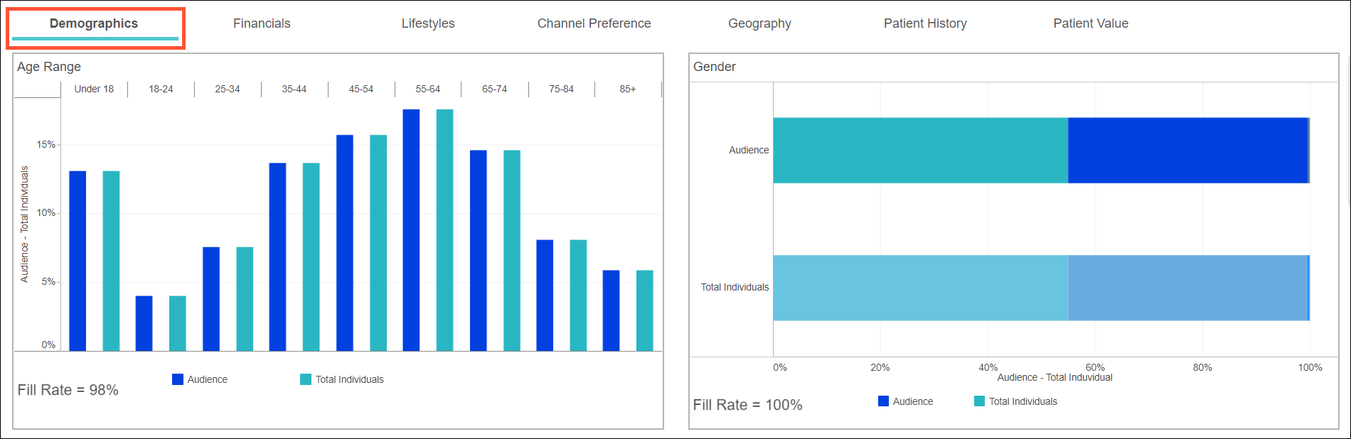 - For select dashlets, you’ll see data represented for 2 groups: audience and total individuals. This shows how your selected audience compares to the general audience in your platform, which can help guide your marketing efforts.