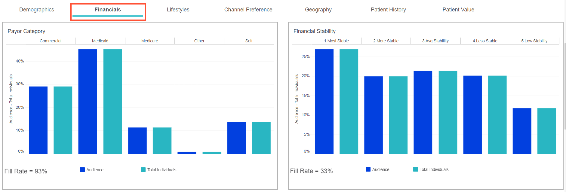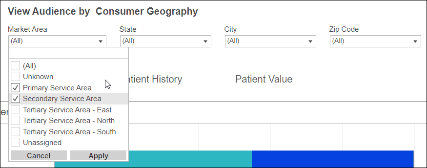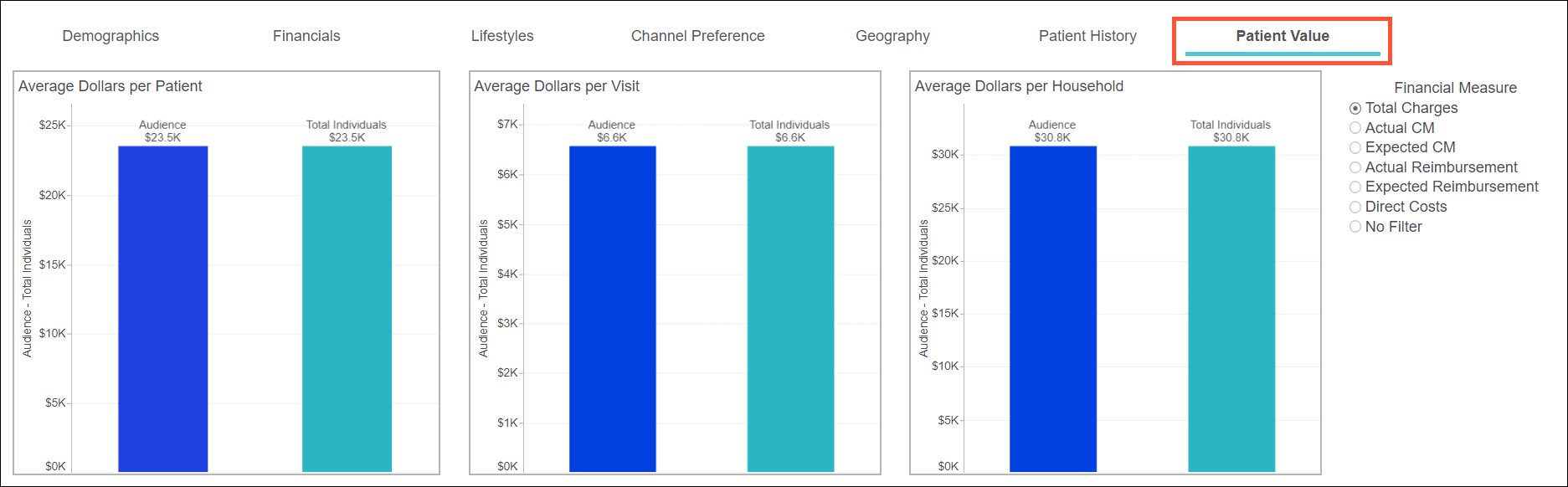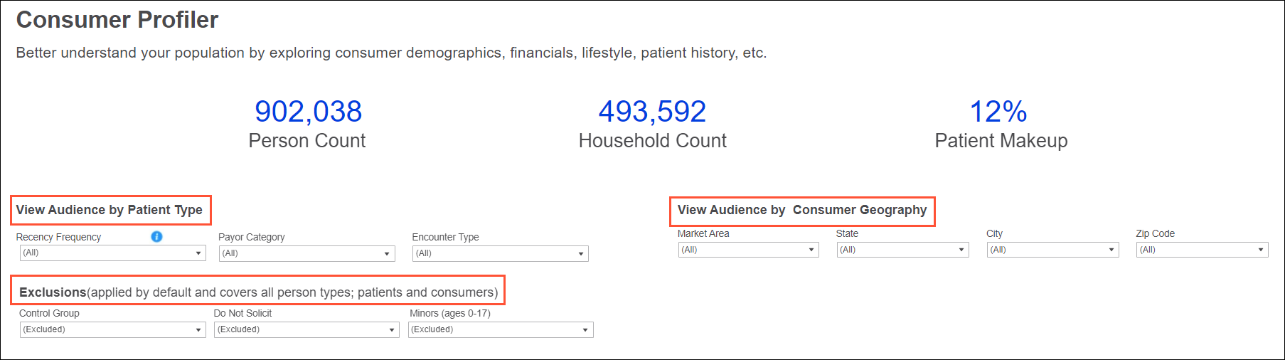 There are 3 sets of filters—1 for each of the audience types and 1 for exclusions—which can be used individually or in combination; for example, to see counts for commercial payers in your primary service area.