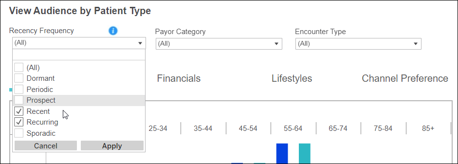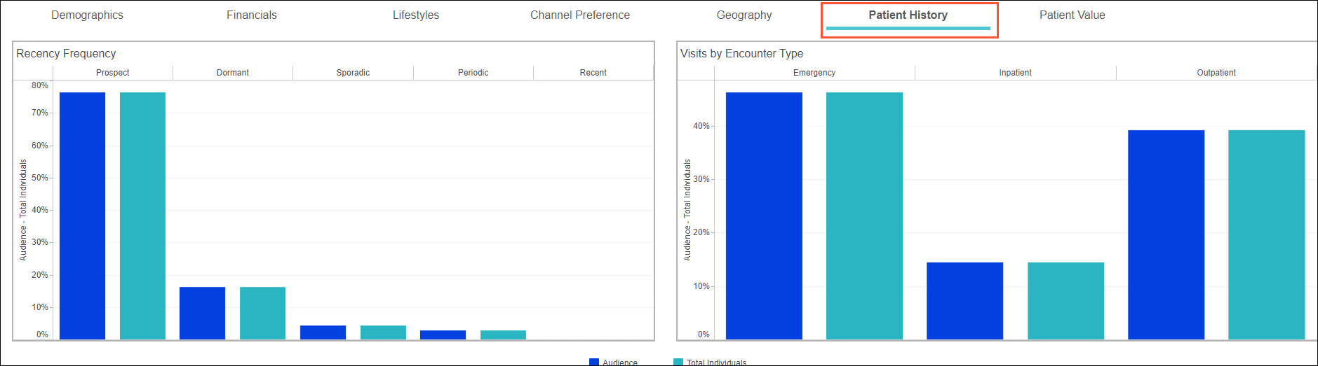 - Recency Frequency: Our proprietary segmentation model, which groups your audience into 1 of 6 segments based on how recently and frequently they’ve visited your health system. Hover over the blue Information icon anytime for segment definitions,