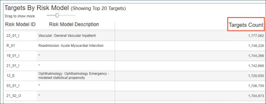 In the Target Insights > Target By Risk Models report, we’ve updated a column header to better reflect the data shown. The label Visits has been changed to Targets Count, which represents the top 9% of individuals the model predicts will likely need those services in the next 12 months.
