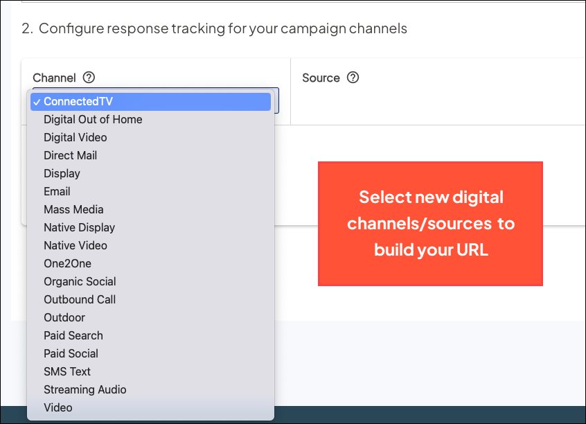 When configuring your response tracking, the Channel and Source dropdowns include the new options to create the trackable URL placed in your media.