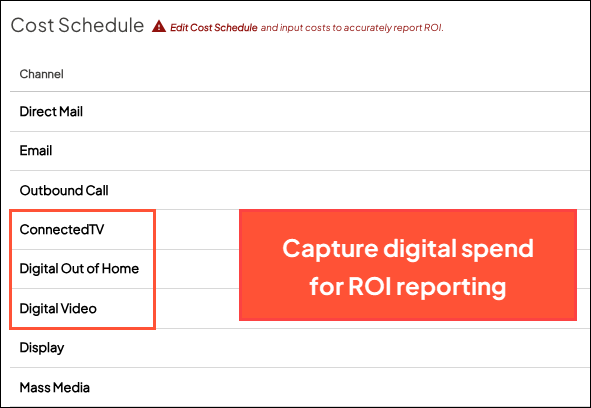 In Campaign Settings, we’ve updated the Cost Schedule with line items for each new option. As always, be sure to enter your investments and fixed costs for each tracked channel to ensure ROI can be reported.