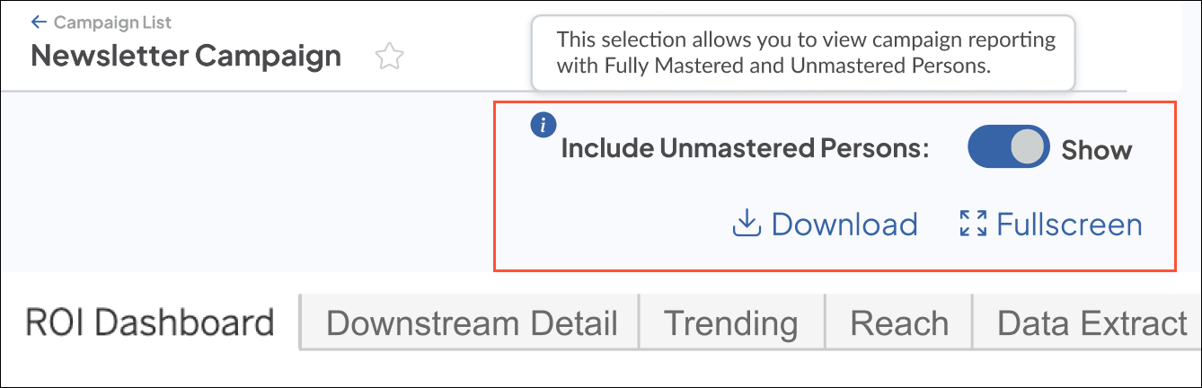 Simply switch on the new toggle in the top right to incorporate the logic, which allows you to view Unmastered Persons alongside your traditional Mastered campaign reporting.