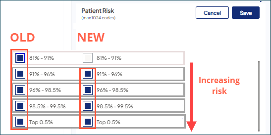 Ahead of this release, we updated the default category selection for the patient risk model. It now includes the top 9% of individuals (categories 4–7), versus the previous default of the top 19% (categories 3–7).