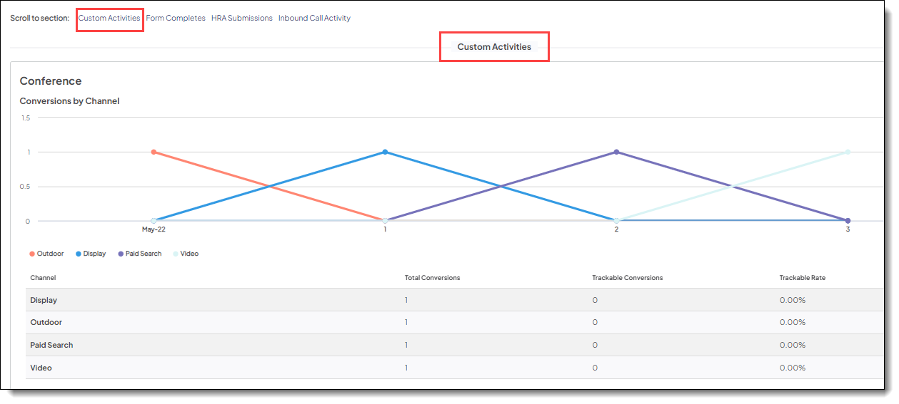 - If there are no custom activities to track for the campaign, the report will not appear. If there are multiple custom activities, a separate report will appear for each.