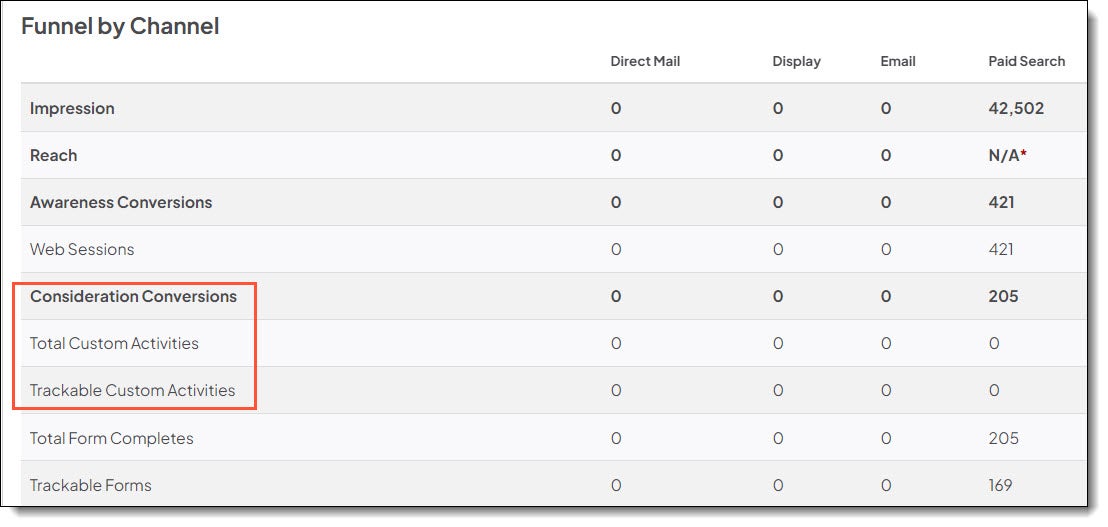- While this report is new, Consideration Conversions for custom activities will also still be captured in the Reports tab > Performance > Funnel by Channel report (shown below) and the Dashboard tab > Consideration Conversions section.