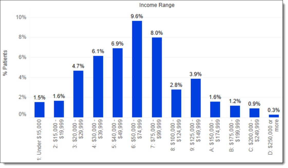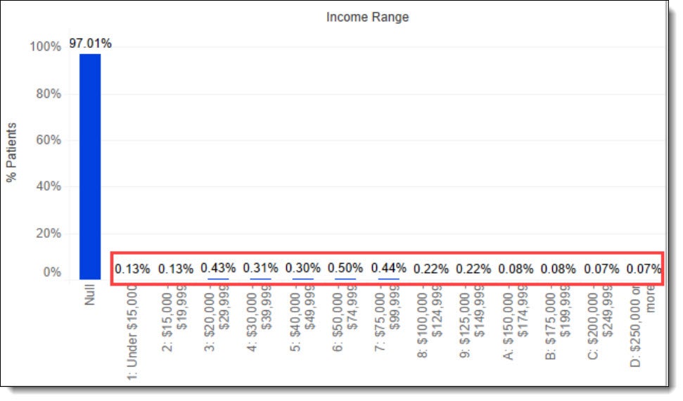 In the Service Line Assessment > Patient Demographics tab, we fixed the visualization for Income Distribution. A data issue was producing too many null values, causing the bar charts to show less than 1% for each of the income ranges. Now the nulls have been reduced and the dashlet displays correctly.