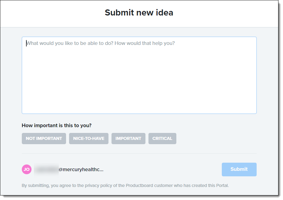 Keep in mind: Your idea won’t appear in the Portal immediately. First it heads to our Product team to determine the fit in our larger plans and potentially merge with a similar request. We may also reach out to you for more details.