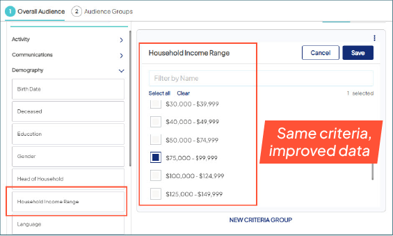 | Household Income | Demography | Select individuals with household income in a specific range. |