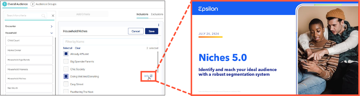 One user-friendly update: in Household Niches, the Info icon next to each segment links to a new quick reference doc for Epsilon Niches 5.0™ (the full version is available in the Help Center). It helps you better understand each Niche — demographics, financials, lifestyle, and more —to guide your audience creation.