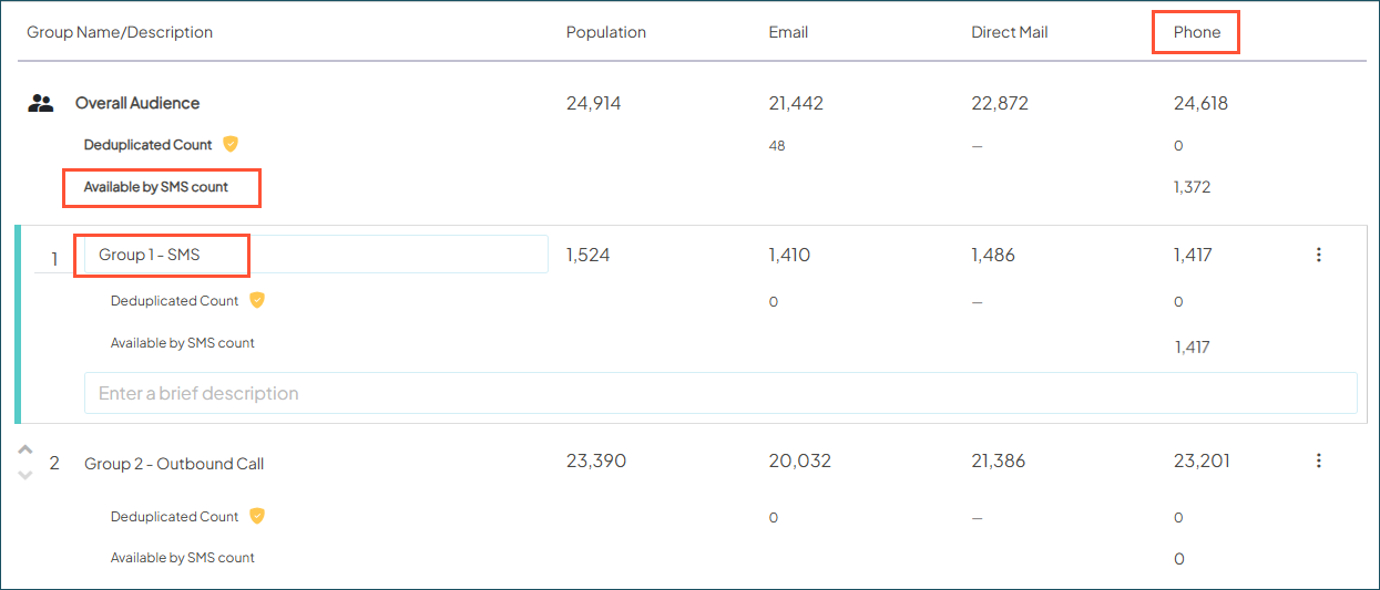 - In Audience Groups, the Phone column (renamed from Outbound Call) now shows the total contacts available by phone, plus a sub-count for those who can receive SMS. You can also create Audience Groups of SMS-only contacts.