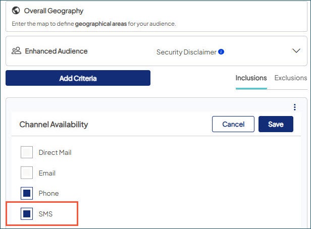 - In your audience criteria, Channel Availability now features SMS as an option. Contacts are included if they 1) are solicitable by phone and 2) have at least one SMS-enabled number.