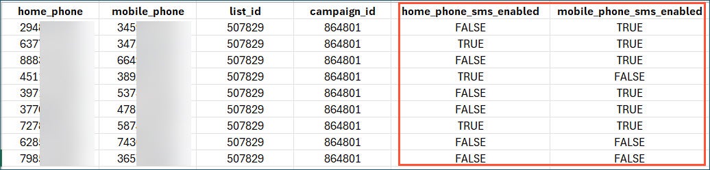 This gives you one file for both SMS and outbound call lists. Plus, it includes two new fields that flag which home and/or mobile numbers are SMS-enabled, so you can easily segment your list before loading into your external tool.