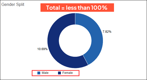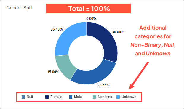 We found that additional categories for Non-Binary, Unknown, and Null, which factor into the total percentage, were being hidden. Now those are displayed in each chart, and all categories together equal 100%.