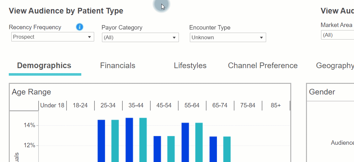 - Target Insights > Target Demographics tab > Patient/Prospect Split (donut chart)