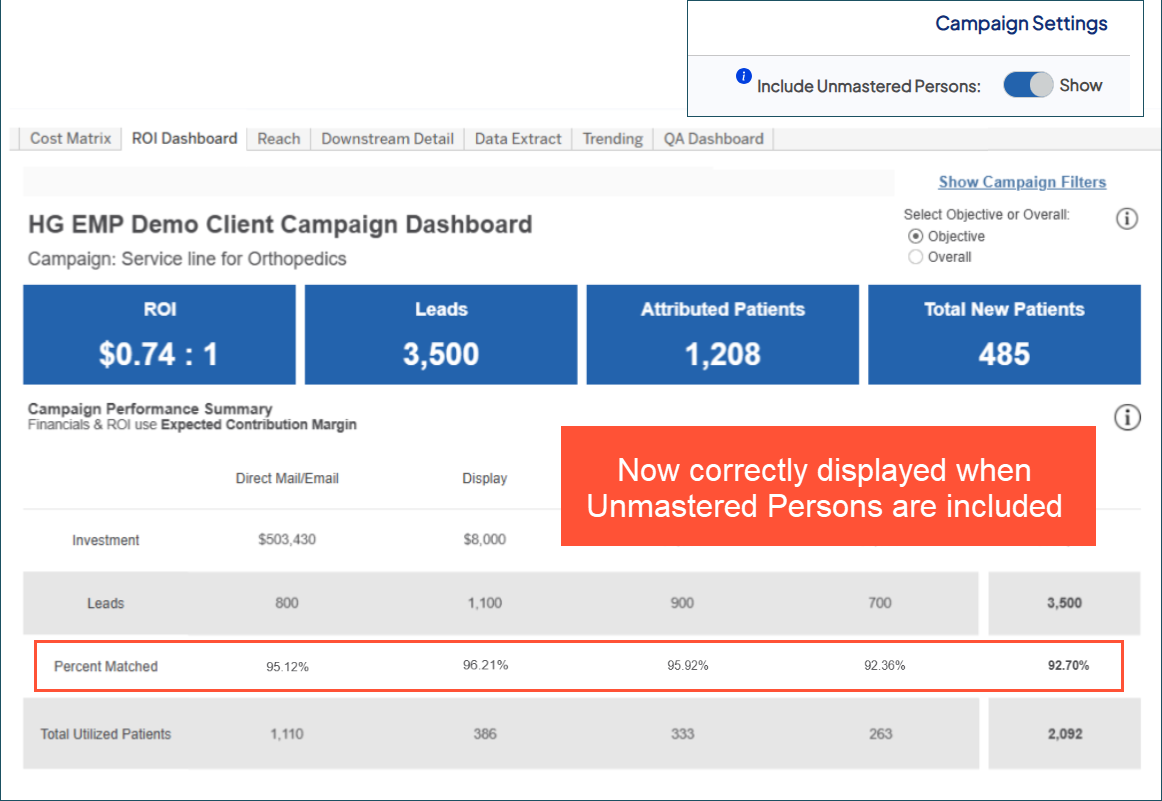 In the Campaign Reporting > ROI Dashboard tab, we resolved an issue where the Percent Matched rate was incorrectly shown as 100% when Unmastered Persons were included. The metric is now accurately calculated and displayed based on the actual percentage of leads matched to patients by channel.
