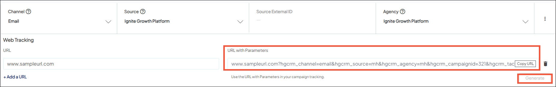 - Click the Generate button to populate the URL with Parameters field with a tracking URL formatted with the specific parameters.